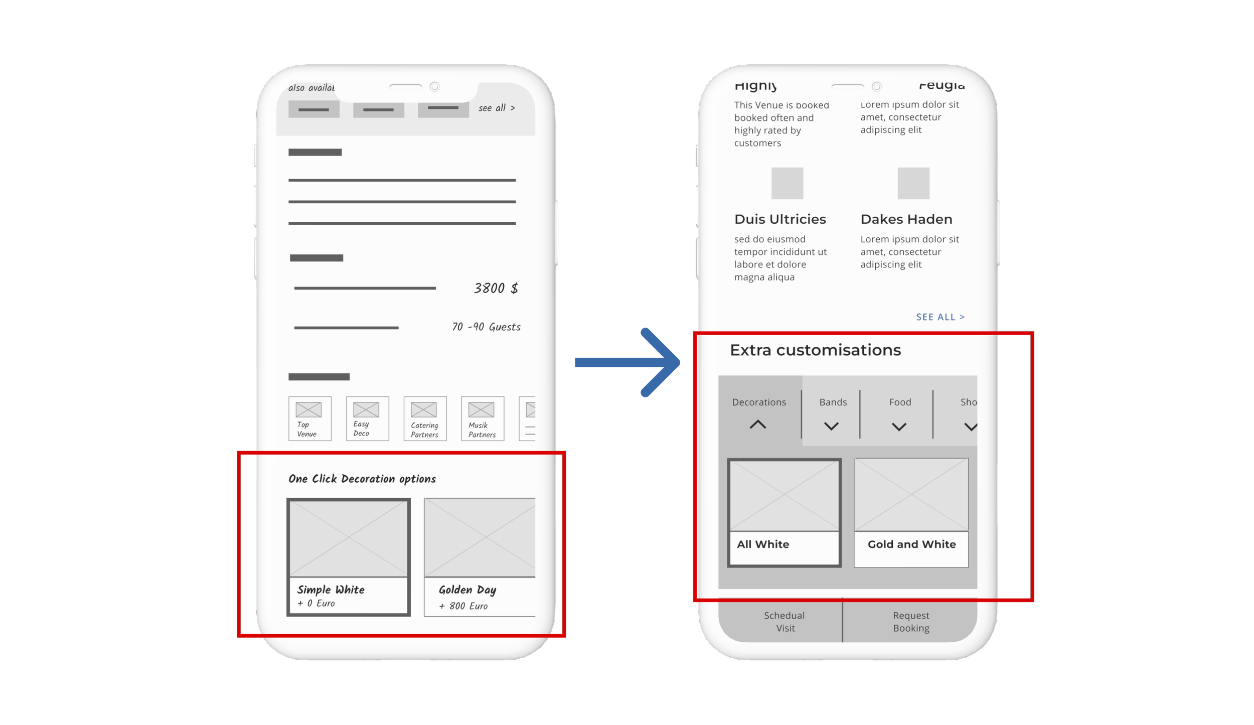 To begin visualising possible ideas , I created rough sketches that outline the main screens and flows for finding available wedding venues. Each screen in this sequence receives multiple variations, detailing how it would appear and which interactive elements are present.
