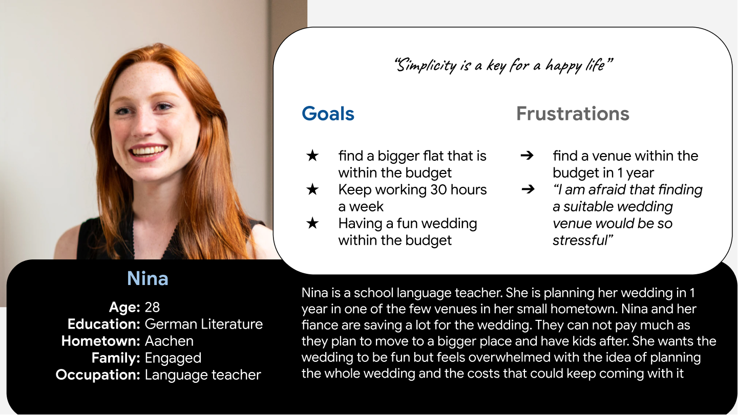 LETS MEET NINA AND MARCELThe research produced two personas, Nina and Marcel, representing user groups. These personas go beyond pain points, incorporating rich background, contextual information, and direct quotes to convey user needs and foster empathy. They play a vital role in guiding our design process, ensuring we address their unique needs effectively.