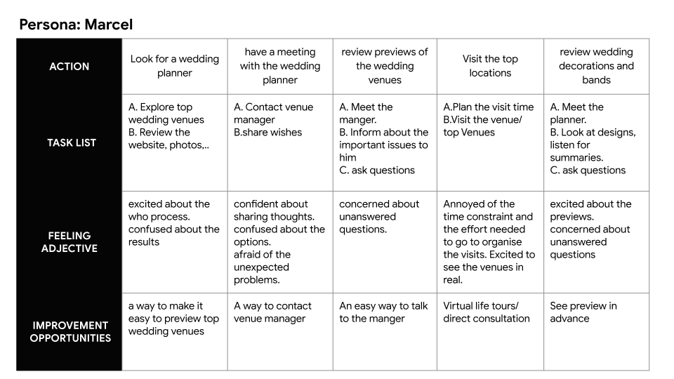These pain points highlighted key opportunities to improve the overall experience of finding and booking wedding venues.